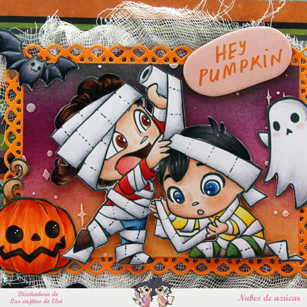 Hoy vengo con trabajo de halloween de @lascajitasdeelvi , y es este sellito tan mono de los nenes disfrazándose! Combinado con el set de complementos, que dan muchísimo juego, calabaza, fantasma y murciélago.